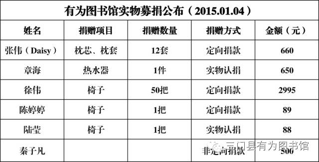 我们会尽快采购这些物资,保证即将到来的讲座和冬令营能够顺利进行。关于具体的收入和支出,请大家关注我们的月刊《有为》,月刊可以在我们的网站 www.ywlibrary.org 上查看,也可以在微博“三门县有为图书馆”上通过下载链接下载。